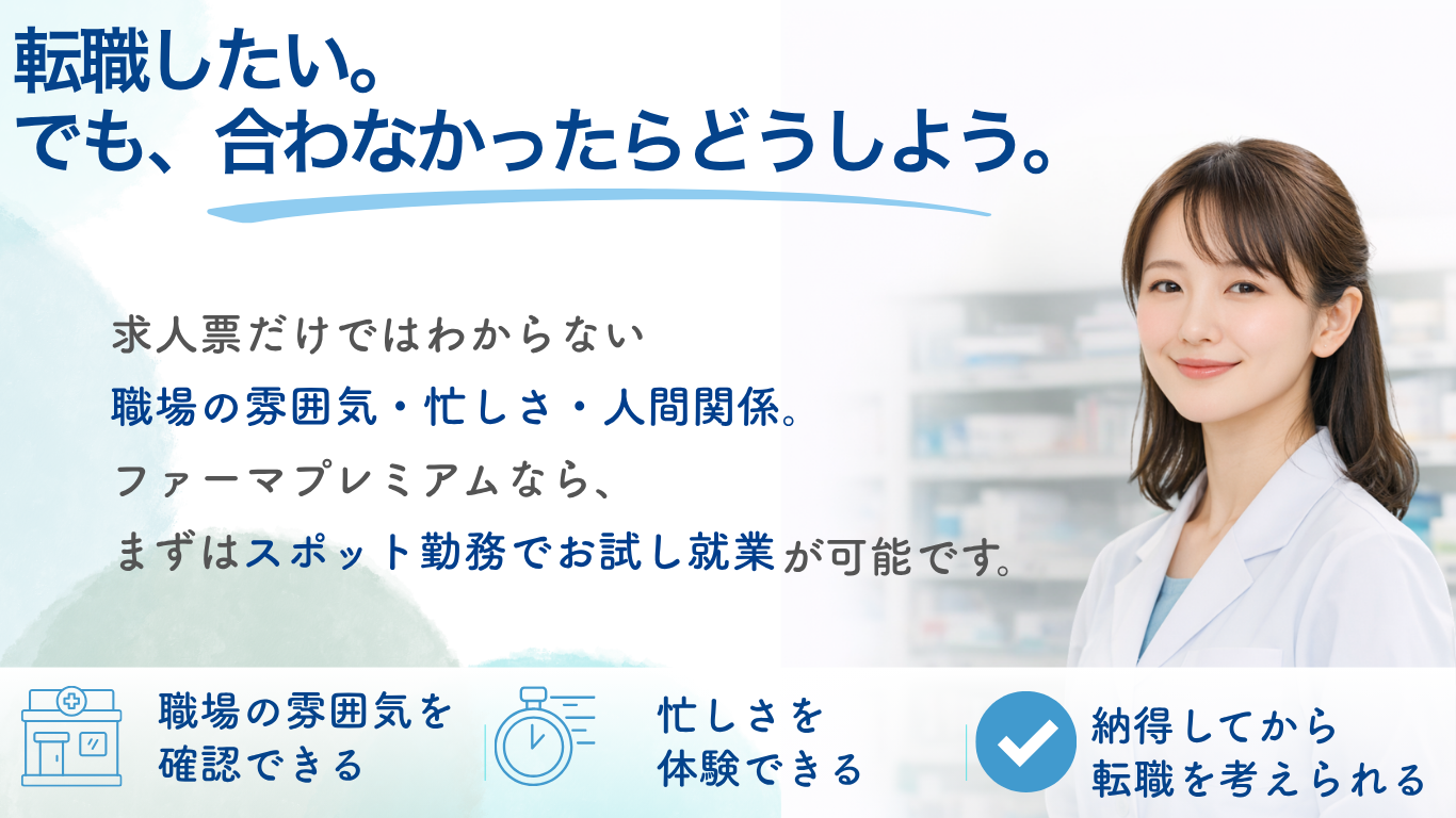 転職したい。でも、こんな不安はありませんか? 次の職場が自分に合うかどうかは、入ってみないとわからない。そんな不安を抱えたまま、一歩踏み出せずにいる薬剤師さんは少なくありません。 その不安、ファーマプレミアムなら“働いて […]