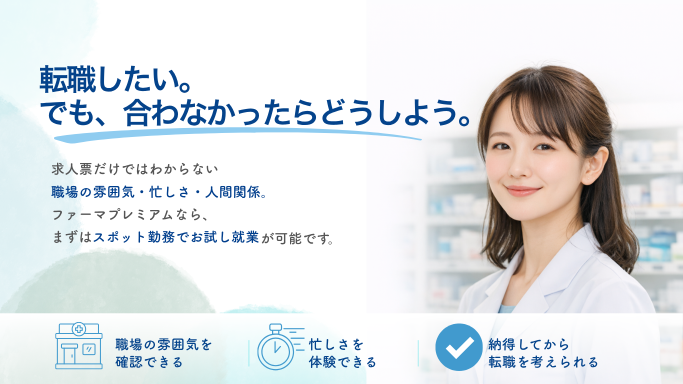 転職したい。でも、こんな不安はありませんか? 次の職場が自分に合うかどうかは、入ってみないとわからない。そんな不安を抱えたまま、一歩踏み出せずにいる薬剤師さんは少なくありません。 その不安、ファーマプレミアムなら“働いて […]